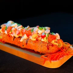 Acompanha: Salmão maçaricado, camarão, cream cheese e geleia de pimenta.