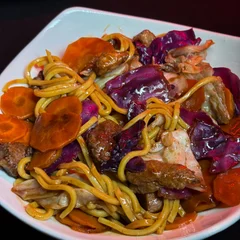 Macarrão envolto em molho especial, cenoura laminada e repolho roxo e verde crocantes.