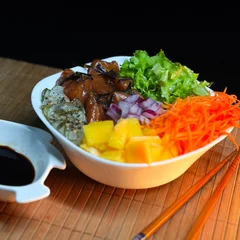 Acompanha: Arroz japonês, salmão grelhado, alface, sunomono, cenoura, manga e cebola roxa.